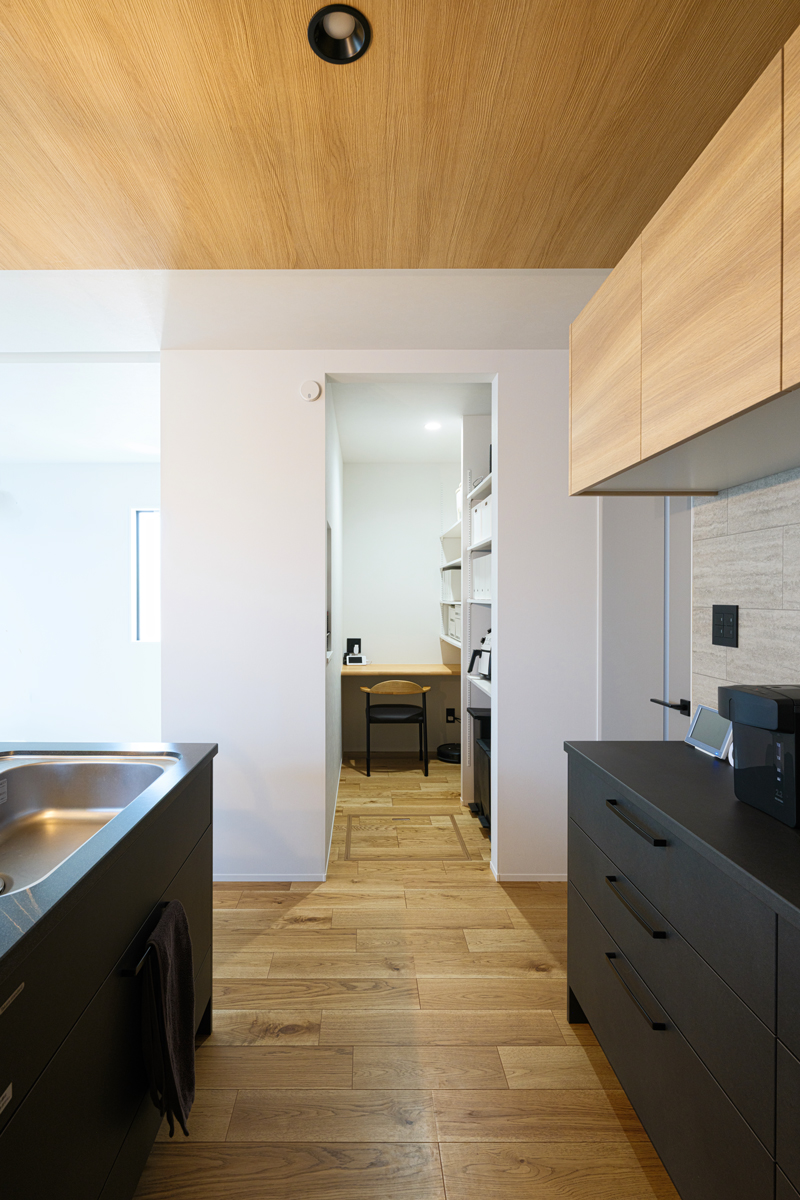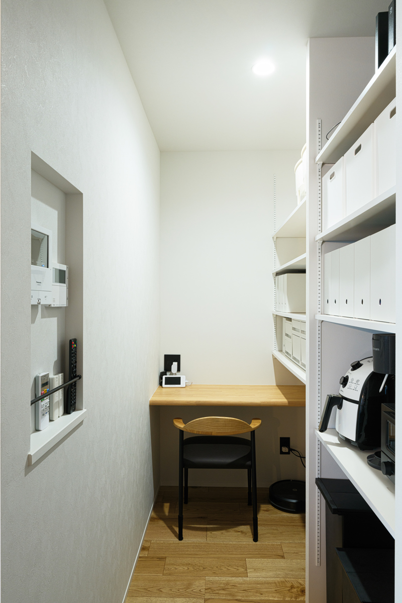 リモートワーク用にPC作業や事務仕事ができるカウンターをパントリーの奥に備え付けてもらいました。この位置ならLDKの気配がしっかり伝わってくるので、畳部屋で子どもがお昼寝しているちょっとの時間でも集中して仕事ができます。