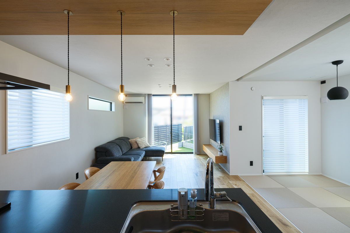 畳スペースの収納扉はハイドアにして、取手も扉と色を揃えて馴染むようにして空間全体の統一感を持たせています。キッチン上のダウンライトは黒縁、リビング側は白縁と使い分けて色彩を統一。キッチンは家電まで黒で統一。色彩をコントロールして視覚的にエリア分けし、開放感を損なうことなく空間をゾーニングしています。「本当は冷蔵庫も色を合わせたいんですよね」とはご夫妻揃ってのコメント。
