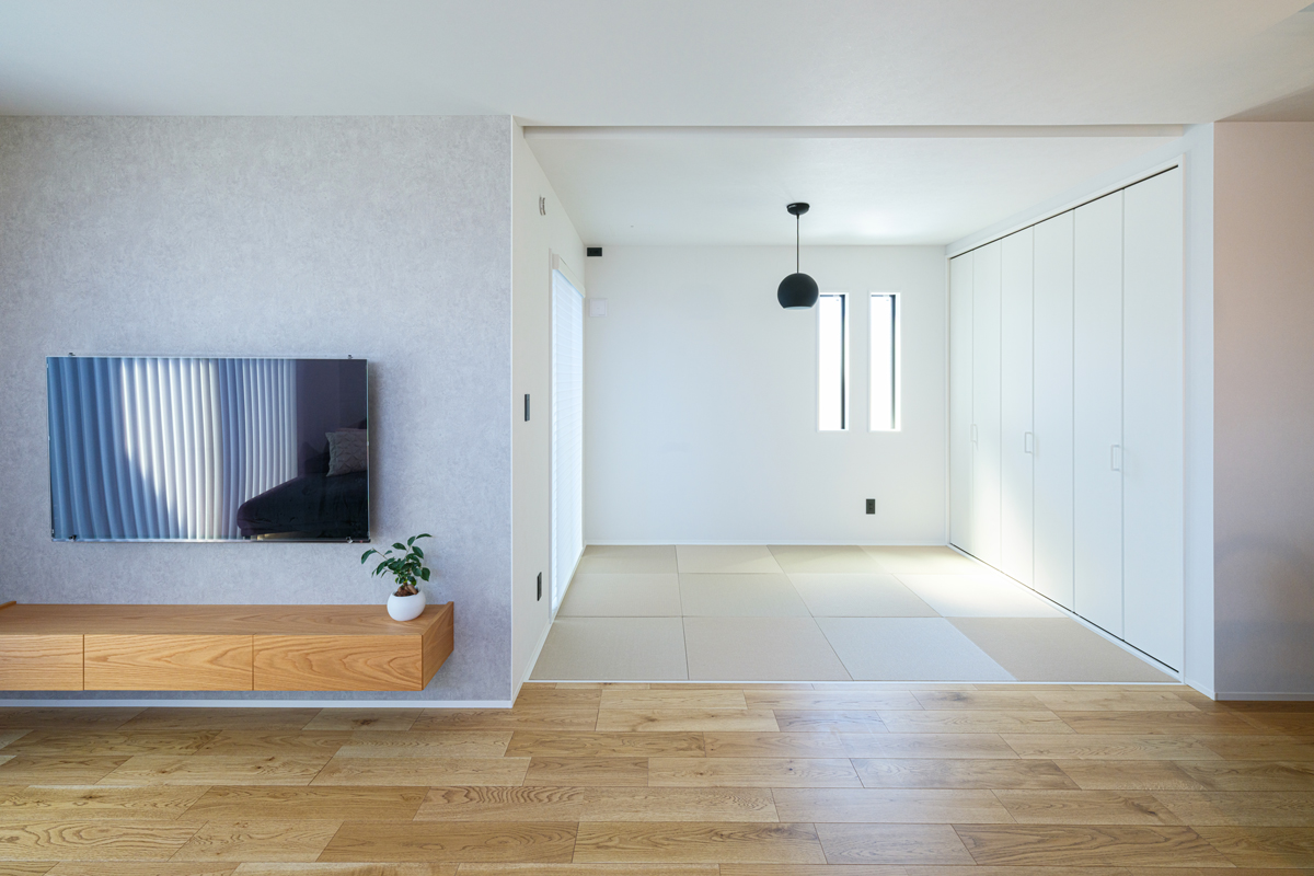 全体的にバランスがとれるように使う色は少なく、抑えめにしました。床は濃い色の木を選ぼうと思っていましたが、ネットで見たり調べたりしていて「重くなって狭く感じるかも知れないね」と妻と話して明るめの色調にしました。TV背面の壁も夫婦で意見が分かれたのですが、最終的にはライトグレーにして正解でしたね。