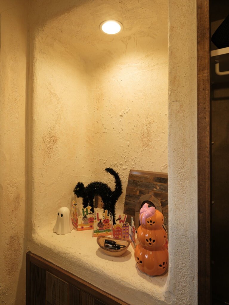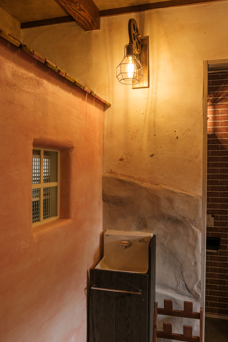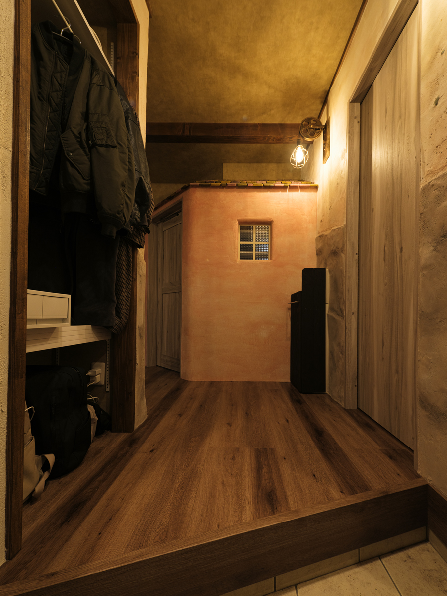 この家に合う照明やインテリアも徹底的に探しましたね。照明も空間の世界観にそって明るくなりすぎないように明度や色味にこだわりました。かといって実際に暮らしていて日中でも暗く感じることはなくて、静かでおだやかな空気感が居心地いいですね。特に夜になると洞窟にこもっているような雰囲気がでて抜群です。扉や化粧梁も綺麗すぎると雰囲気が出ないので、設計の平田さんとも話し合って建築途中にあえて引っ掻き傷を入れたりエイジド加工をしました。