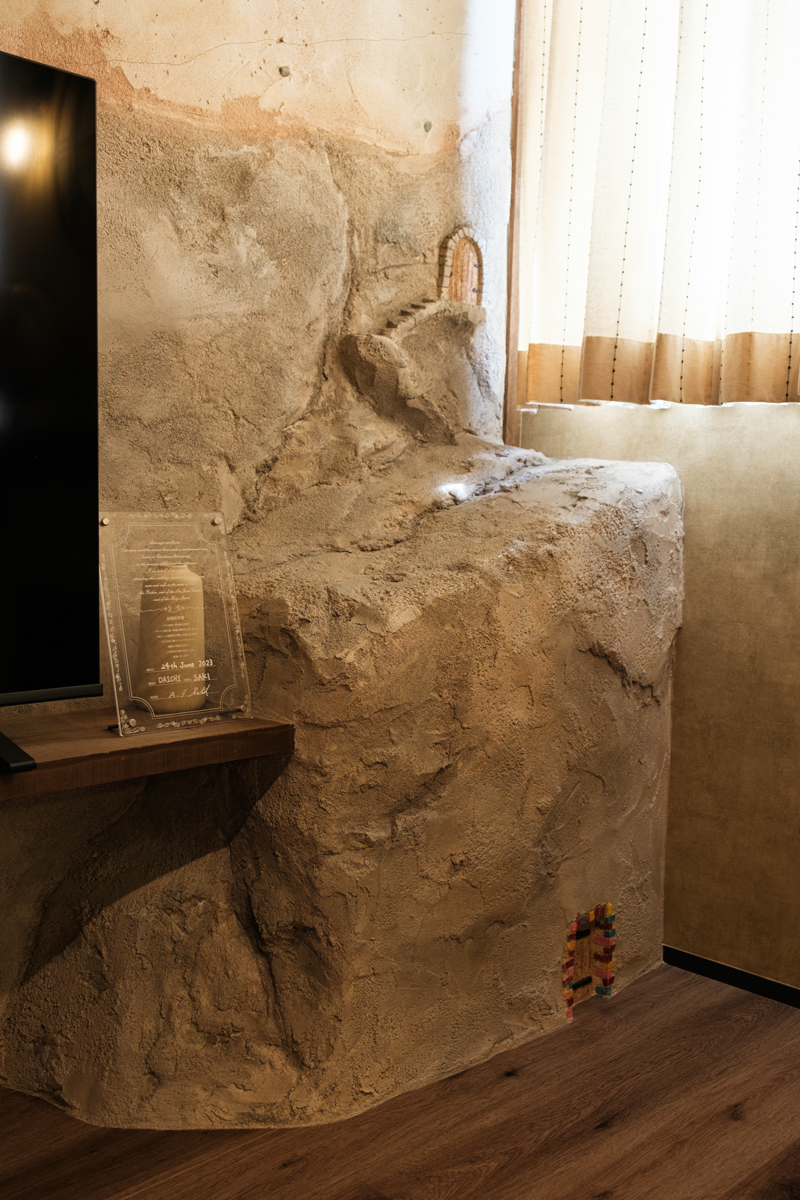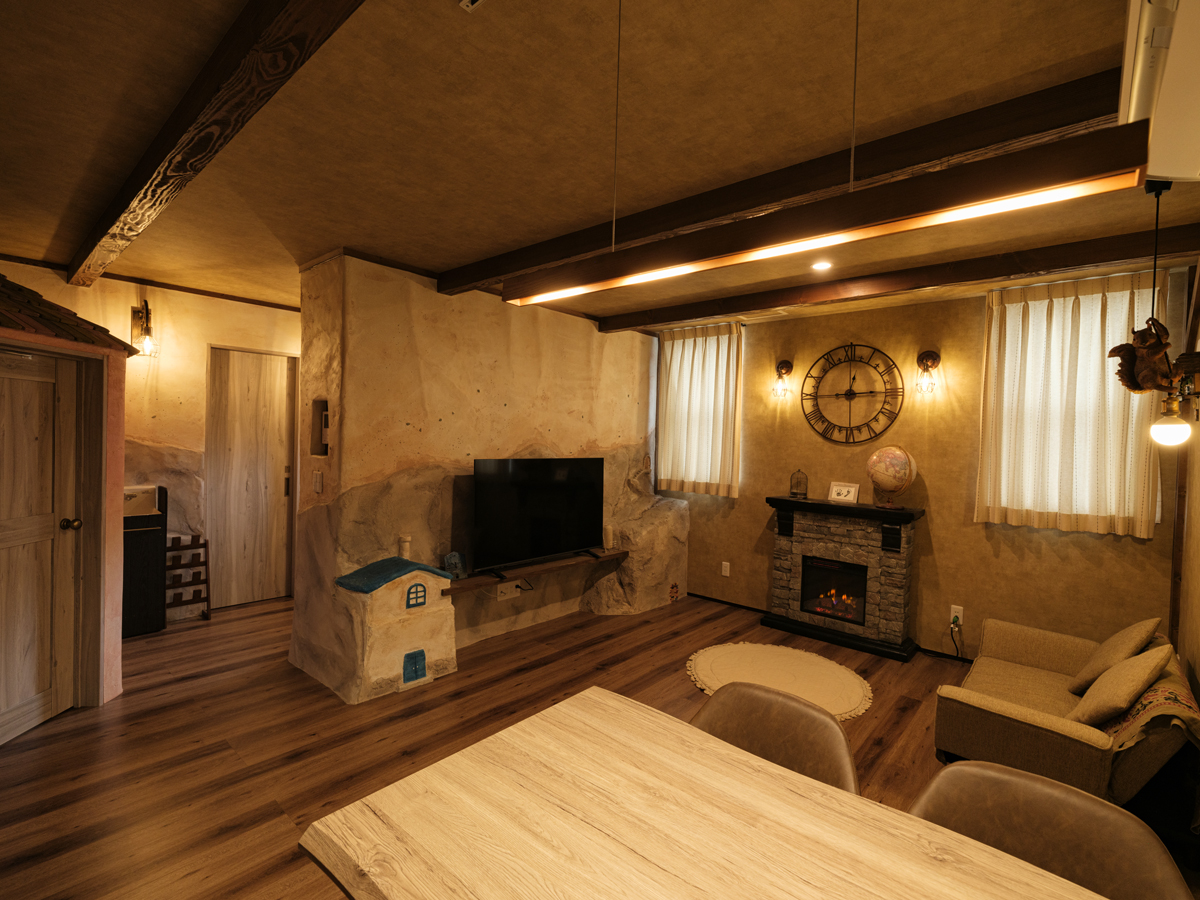 いまだについ見惚れてしまうくらい忠実に世界観を再現してもらいました。リビングは絵本から飛び出した王国のイメージ。壁のつくりなど装飾にもバックグラウンドがあって、たとえばTVボードになっている壁は夜になると照明にしがみついているリスが降りてきて、脇の階段を昇って巣に帰っていくというストーリーにそってデザインされています。怪我しない程度のゴツゴツした質感で上手く仕上げてくれています。