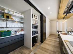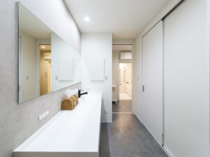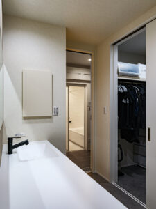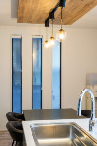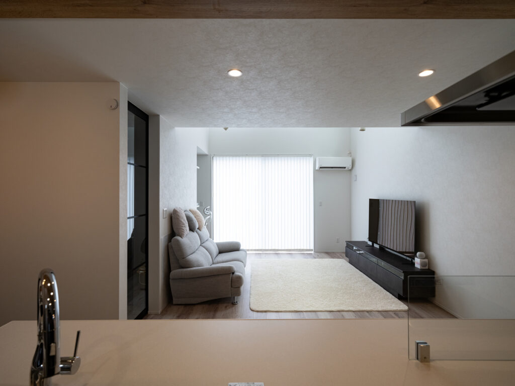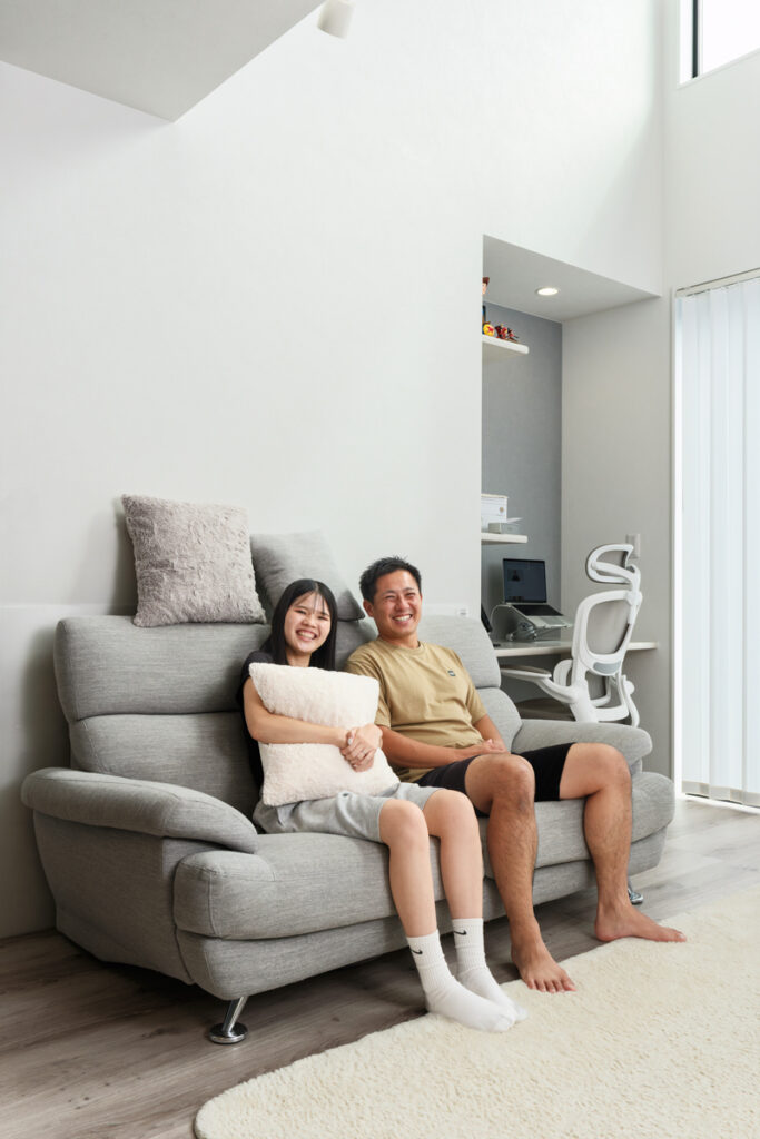 吹き抜けからやわらなか光が広がるリビング、しっとりとした落ち着きに包まれるリビングダイニング。存在感のある重厚な外壁とは対照的に、内に広がるのは居心地のいい洗練されたシンプルモダンな住空間。ご夫妻が思い描くご要望を一つひとつ丁寧に汲み取ってカタチにしました。暮らしを楽しむための豊かな空間デザインが、そこにありました。