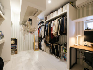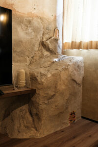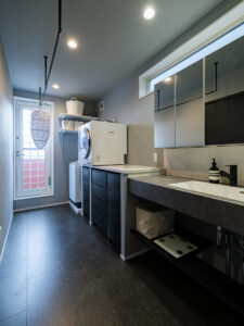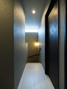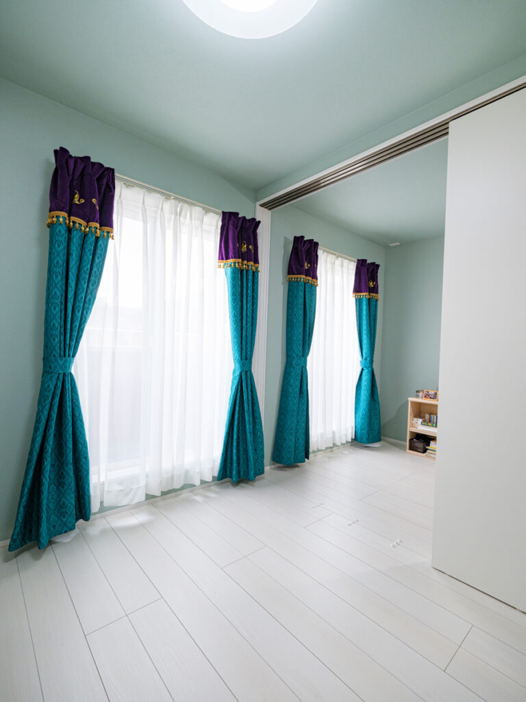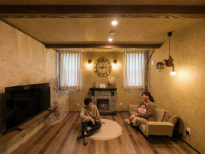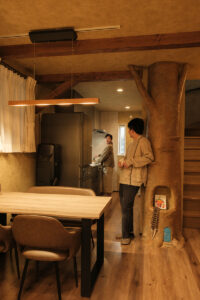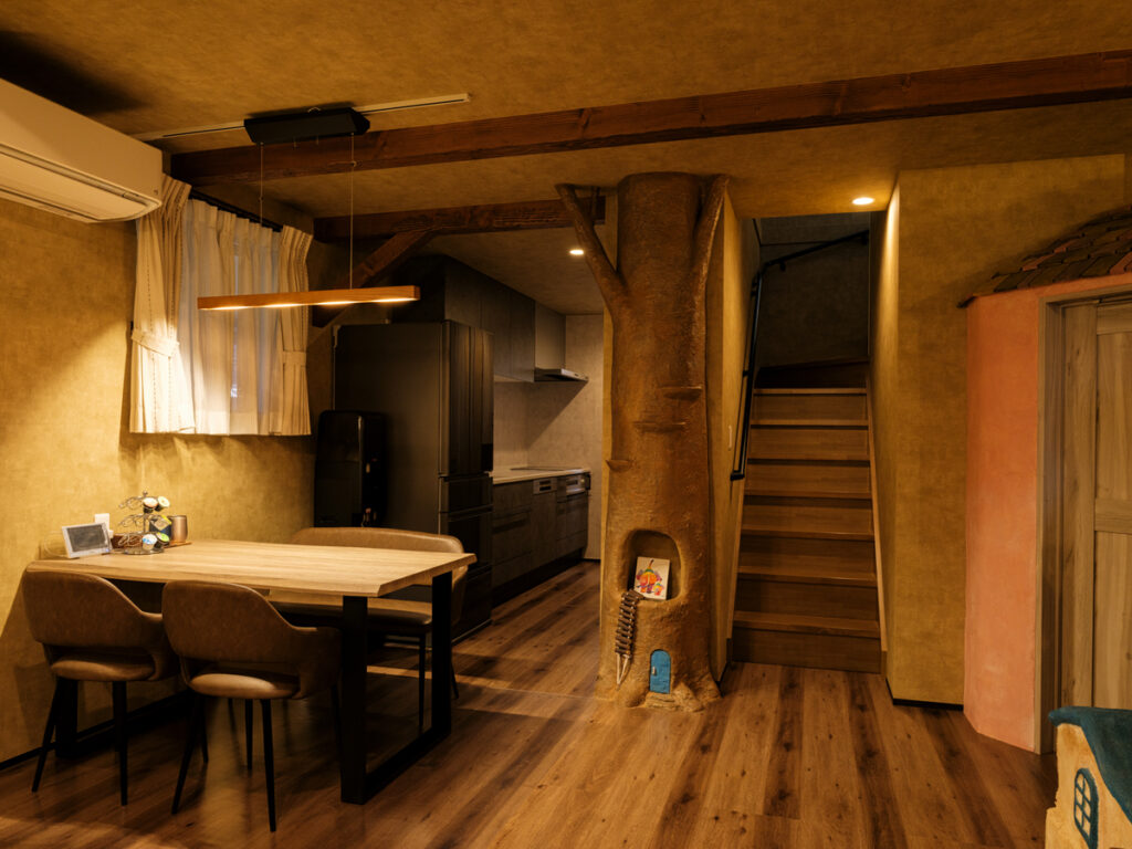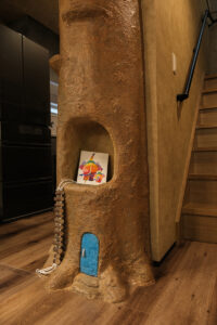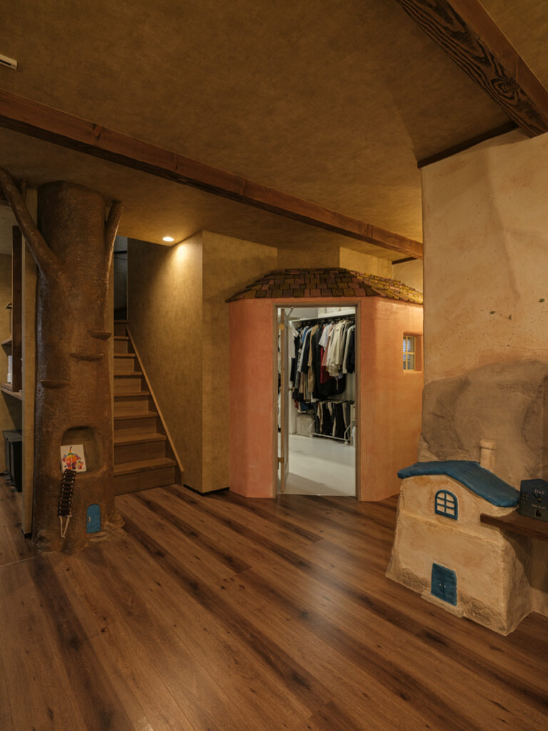 ここはF様ご夫妻が叶えた『夢の家』。玄関を開けると一層、アミューズメントパークに迷い込んだような錯覚に陥ります。家の中にひと回り小さな家があったり、家の中心にシンボルツリーが立っていたり、大小いくつも扉があったり…振り切ってこだわり抜かないと、固定概念に囚われていては中途半端になってしまう。関わる全員の強い想いが、住宅という括りの中にも一線を画す新しい世界を生み出しました。